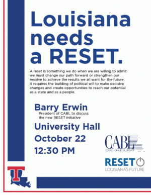 Join us in welcoming Barry Erwin, President of the Council for a Better Louisiana (CABL), who will be talking about an initiative to RESET Louisiana's Future. The event will be held in University Hall on October 22nd at 12:30pm.